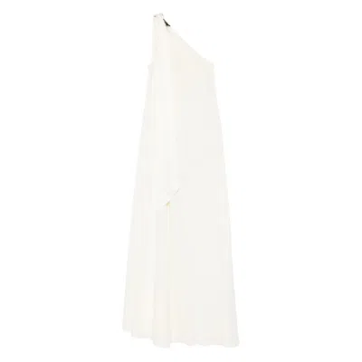 Ubud White Maxi Dress With One-shoulder Design And Scarf Detail In Toile-de-jouy Jacquard Woman In Neutral