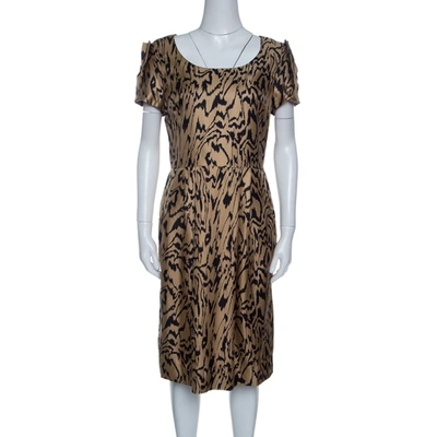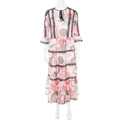 Pre-owned London Almond Dotted Jacquard Dobby Shire Printed Tiered Midi Dress M In Beige