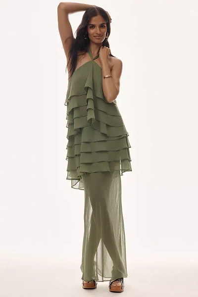 Gaia Sheer Ruffle Halter Dress In Green