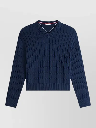 V Neck Cable Knit Ribbed Trim Top In Blue