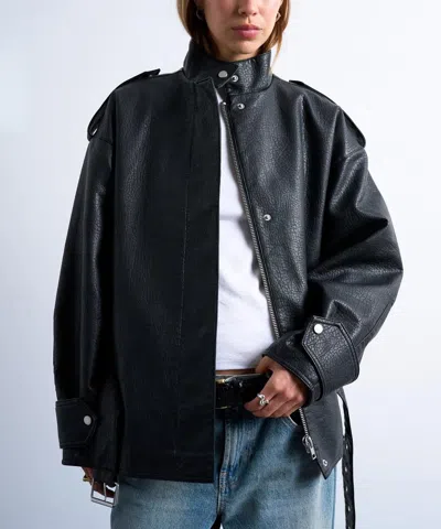 Faux Leather Washed Ma1 Bomber Jacket In Black