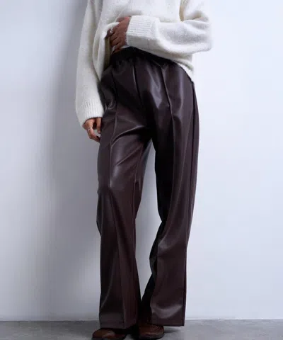 Women's Chocolate Brown Faux Leather Wide Leg Joggers With Pinseam Detail