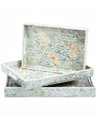 Palawan Flower Set Of 3 Mother-of-pearl Lacquered Trays In Blue