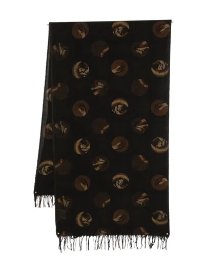 Floral Pattern Virgin Wool Scarf With Fringes In Black