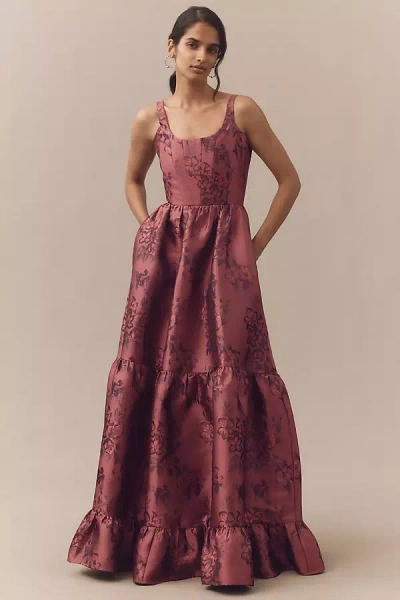 Avery Scoop-neck Tiered Floral Brocade Maxi Dress In Pink