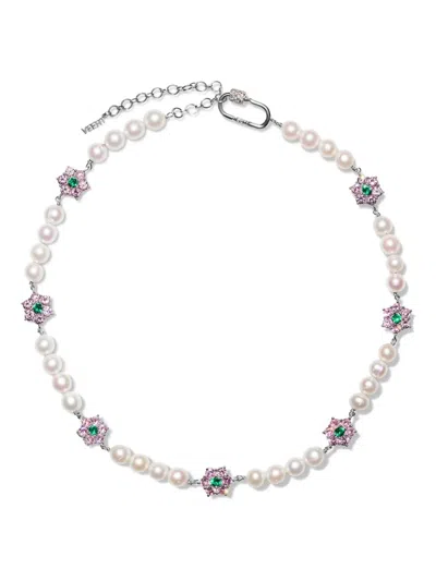 18k White Gold Pink & Green Flower Stone Freshwater Pearl Necklace In Silver