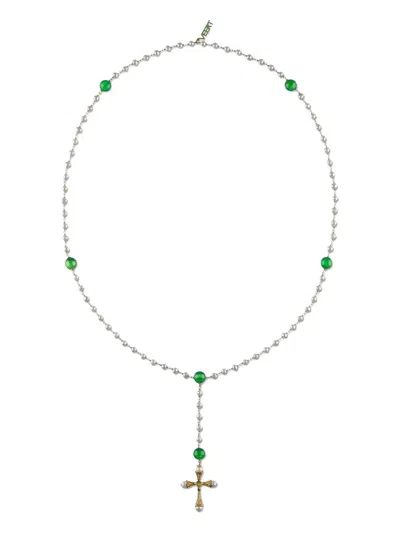 18k Yellow Gold Rosary Freshwater Pearl, Green Onyx And Peridot Necklace In Silver