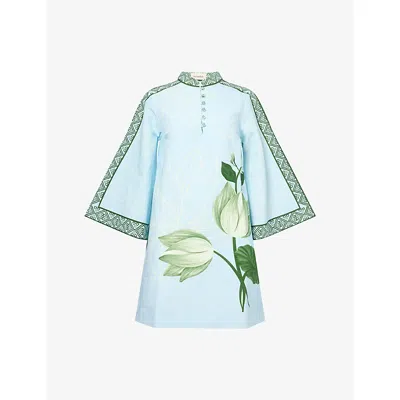 Womens Ice Blu Emrld Lotus Toda Anj Cotton-hemp Kaftan Mini Dress In Multi