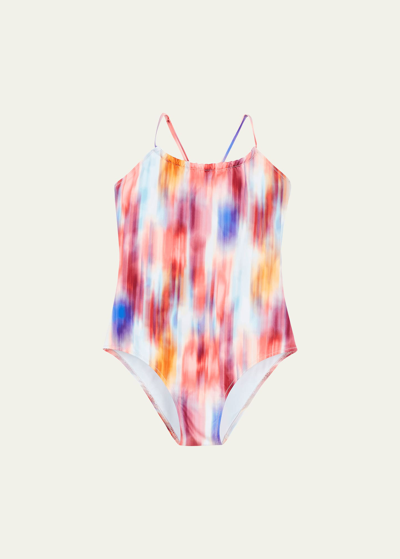 Kids' Girl's Peace Trees-print Ruffled One-piece Swimsuit In Blanc