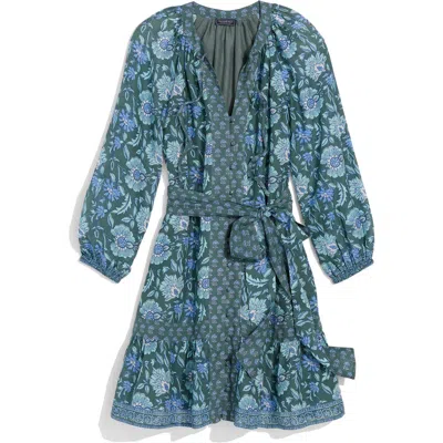 Print Tie Waist Long Sleeve Dress In Blue