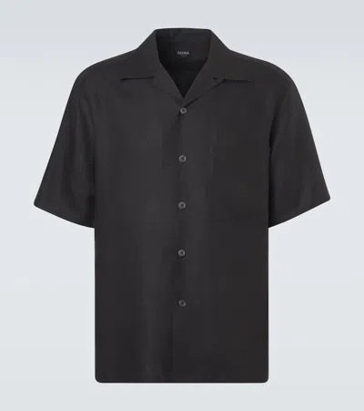 Oasi Linen Shirt Cuban Collar Short Sleeves In Black
