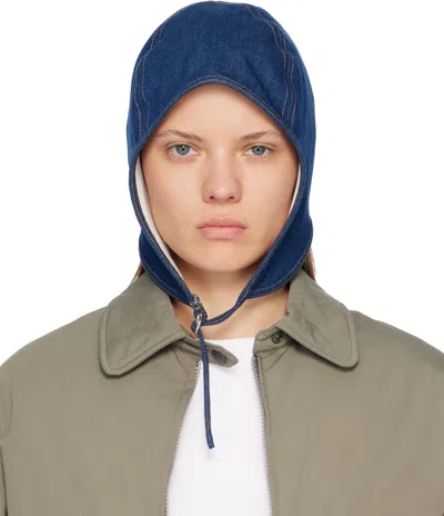 Denim fabric, drawstring, logo embroidery on the back, twill lining, tan contrast stitching.