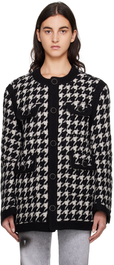 黑色和白色、羊毛混纺、粗花呢、千鸟格纹、迷你logo吊牌、圆领、正面纽扣、四个正面盖袋、长袖、平直下摆。请注意,这款商品采用无性别风格,符合男装标准尺码。