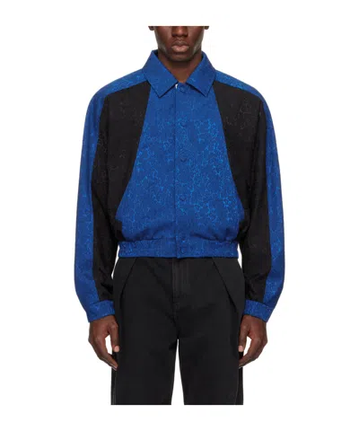 Stitching, lapel, snap front, welt pocket, elastic hem and cuffs, raglan sleeves, logo and flag design on the back.