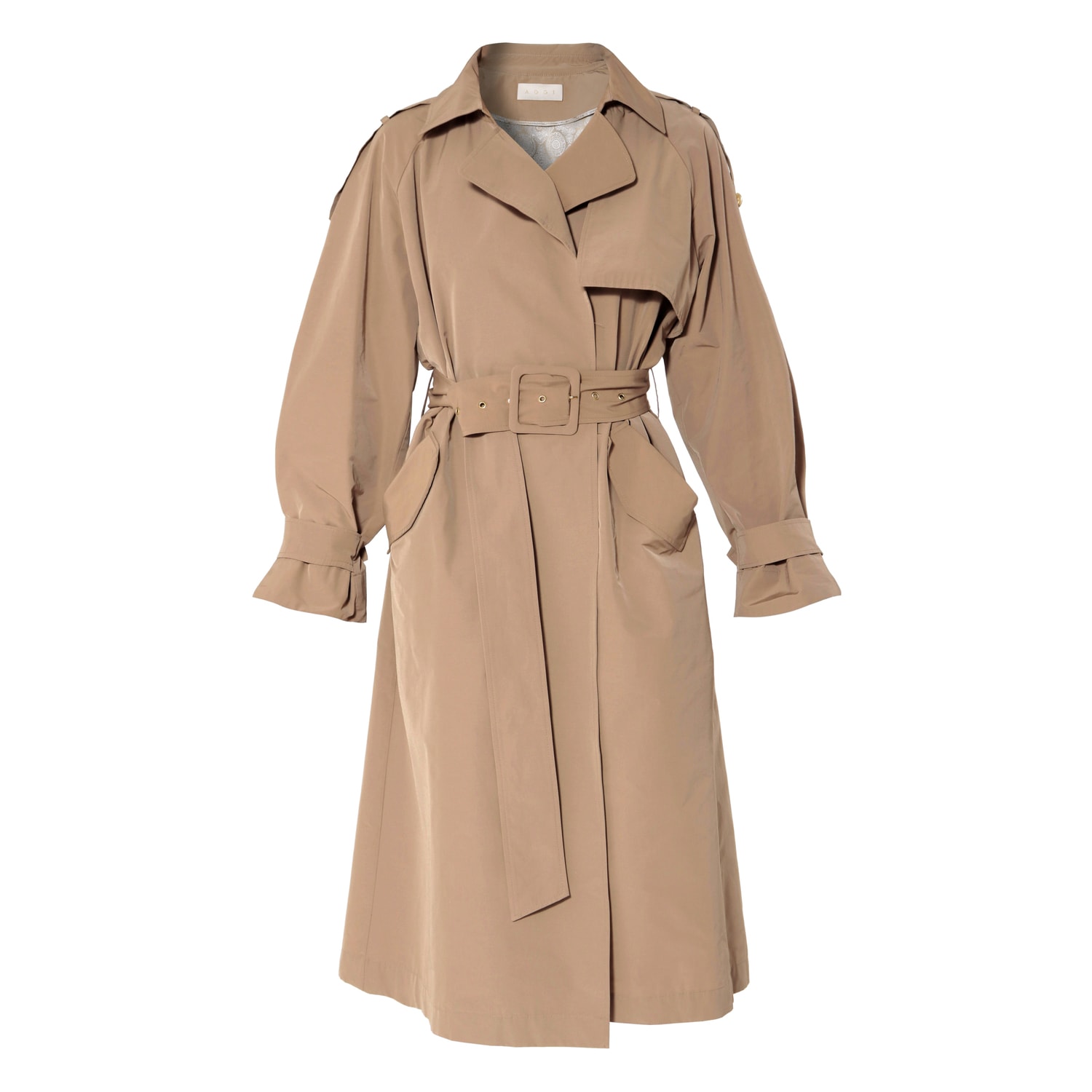 A light trench coat in beige. This trench has classic flaps and side pockets. It is fastened with a belt and has wide straps around the wrists.Length from the highest point on the shoulder 117cm (XS, S, M, L)Armpit width 53cm(XS); 55cm(S); 57cm(M); 59cm(L)