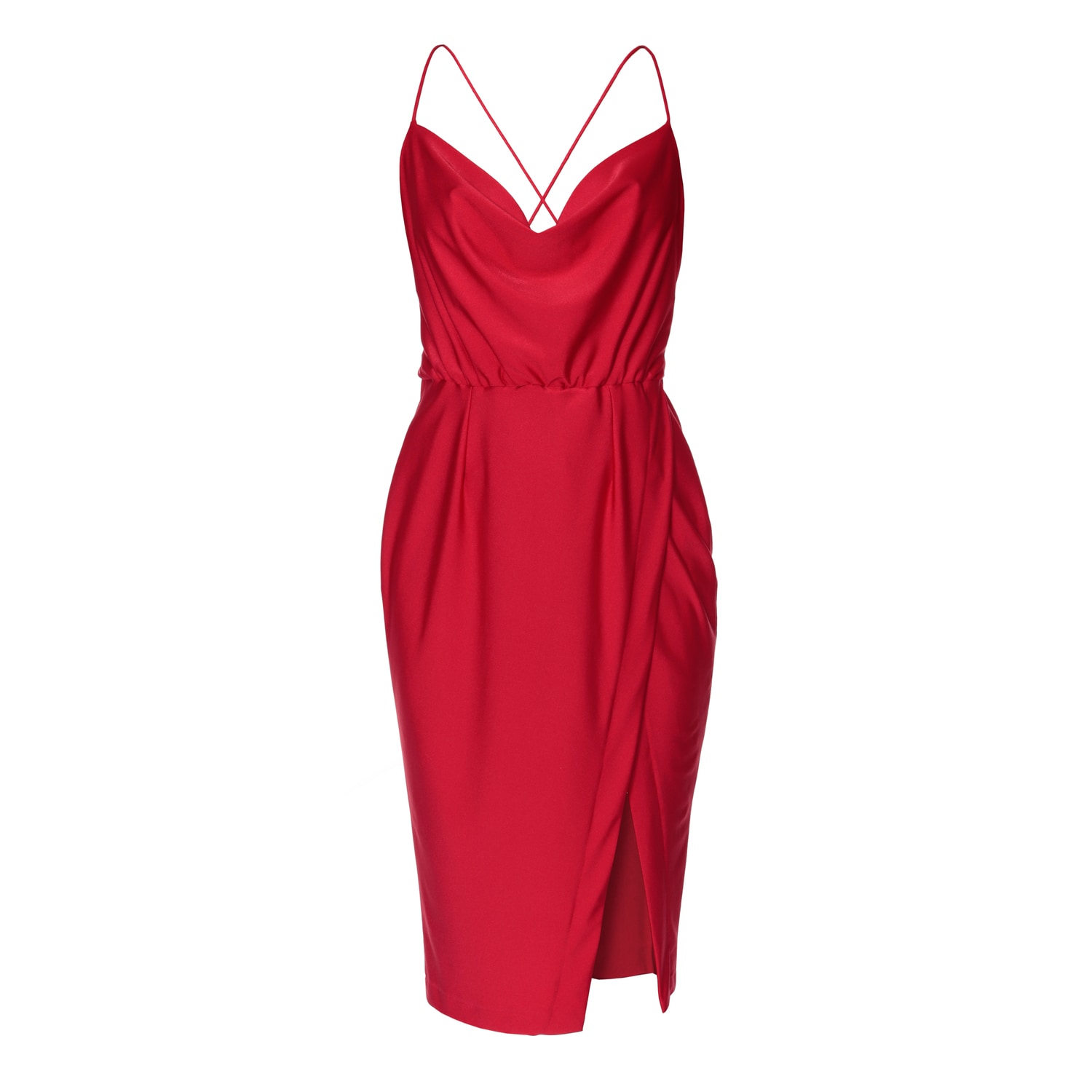 A midi dress in an intense red colour made of a material with elastic properties. Neckline with draping forming a soft wave. High cut on the left thigh. A very deep cut back with thin crossed straps. For the best fit, please refer to the detailed table of our sizes, which you can find in the Size Guide tab, and our detailed sizing in the Sizing tab. Hand wash with delicate detergents Do not wring out Do not iron COMPOSITION: 85% Polyamide, 15% Elastane