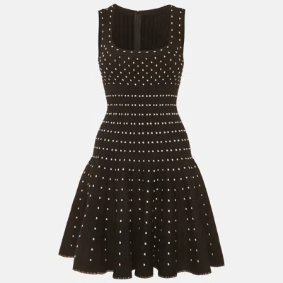Crafted from ribbed knit this Alaïa mini dress features polka dot detailing a square neck a back zipper and a flared hem. The fitted bodice and sculpted shape reflect the House's technical approach to knitwear.