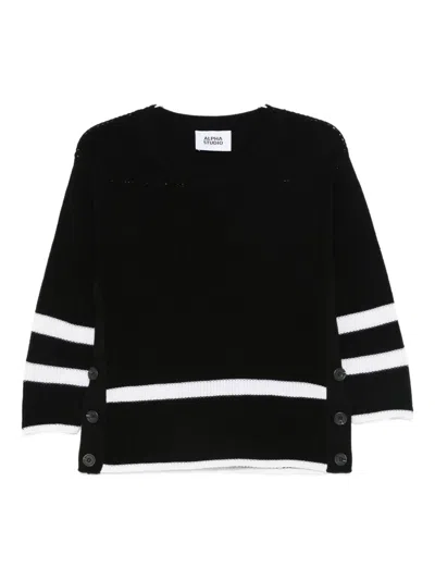 黑色 条纹 圆领 纽扣细节 长袖 罗纹下摆