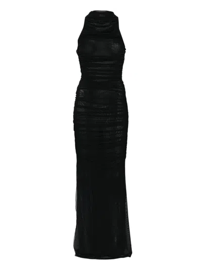 Invisible back zip closure Halter neckline, racerback, high collar; sleeveless Side slit Gathered and draped detailing Layered-effect sheer mesh with tone-on-tone lining design Slim fit Black color 92% Polyamide, 8% Elastane Made in India