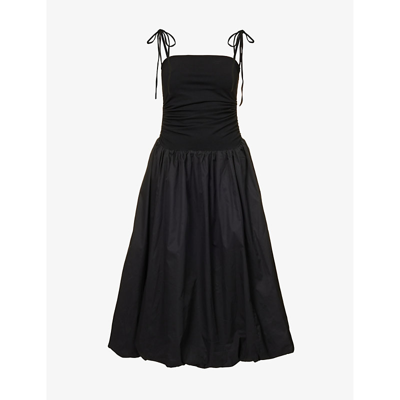 Midi dress with stretch fitted bodice and a full cotton skirt. There are drawstring tie details on either side of the bodice to create a slight ruched effect. The skirt is fully lined and has a puffy effect. Content + Care Upperbody: 90% cotton, 10% elastane, skirt:100% cotton Dry clean Imported Size + Fit S: Length: 48 inches, bust: 26.4 inches, waist: 23.2 inches, bottom hem: 103.6 inches, shoulder: 15.4 inches M: Length: 48.4 inches, bust: 28.4 inches, waist: 25.2 inches, bottom hem: 105.6 inches, shoulder: 15.9 inches L: Length: 48.8 inches, bust: 30.4 inches, waist: 27.2 inches, bottom hem: 107.6 inches, shoulder: 16.4 inches Amy Lynn Puffball Midi Dress in Black, Women's at Urban Outfitters