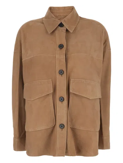 棕色 贴袋 钮扣开合 尖领 搭扣袖口