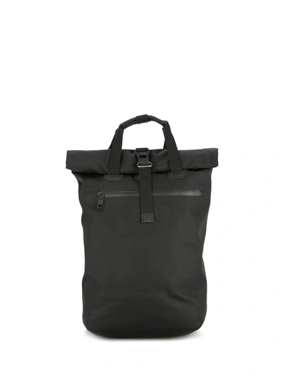 Black rectangular shaped backpack from AS2OV featuring a top handle, a foldover top, a buckle fastening, a front zip pocket and adjustable shoulder straps.