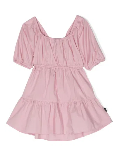 blush 粉、弹性棉质、方领、泡泡短袖、结饰细节、后置系带、缩褶细节、露背、伞形裙摆、弧形边。