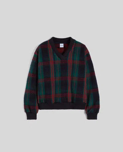 蓝色 格纹图案 V领 长袖 罗纹下摆