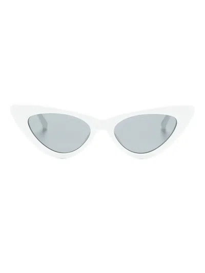 白色、醋酸纤维、猫眼镜框、灰色镜片、镜腿饰有logo标牌、直镜腿、带弧度镜脚套。这款商品随附保护盒。