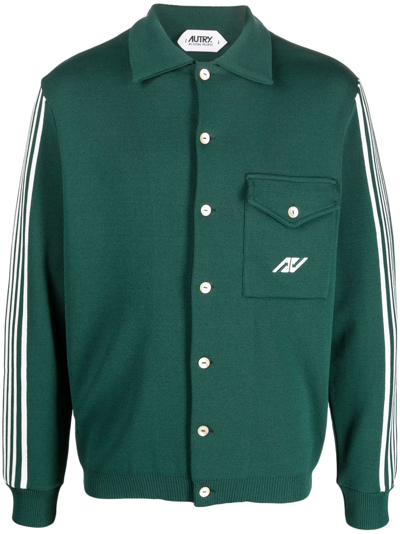 森林绿色、条纹细节、胸前饰有logo刺绣、宽领、正面纽扣、胸口饰有盖袋、长袖、弹性松紧边、平直下摆。
