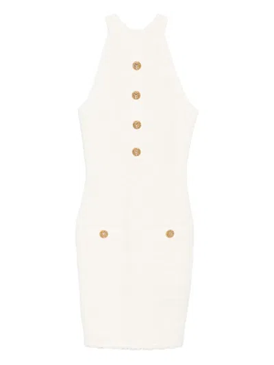 white textured effect gold-tone buttons sleeveless round neck