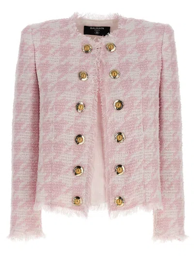 粉色 粗花呢 棉质混纺 毛边 无领设计 长袖