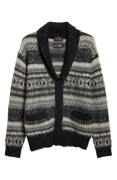 BEAMS Shaggy Fair Isle Shawl Collar Cardigan In Gray