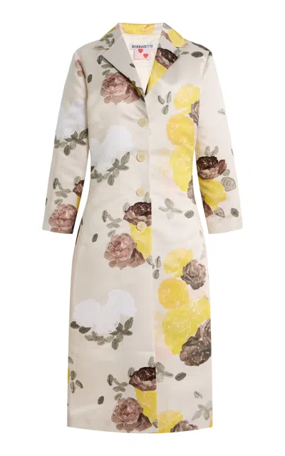 Helmed by Belgian mother-daughter duo Bernadette and Charlotte de Geyter; Bernadette is rooted in the special; delicacy-like allure of gorgeous; found vintage lingerie.The long coat is crafted in a soft silk-satin with hand-painted Auscot Rose motif in yellow and chocolate on vanilla. A timeless outer layer for the cooler months — style it on its own as a dress; or layer it over an evening look.