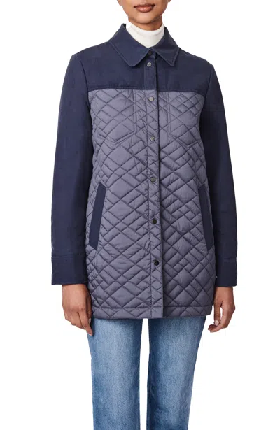 Combo fabric quilted shacket made from micro touch pongee fabric (100% Polyester) and 100% recycle polyfill. Features button closure and welt pockets. Machine wash cold in delicate or gentle cycle, separate.