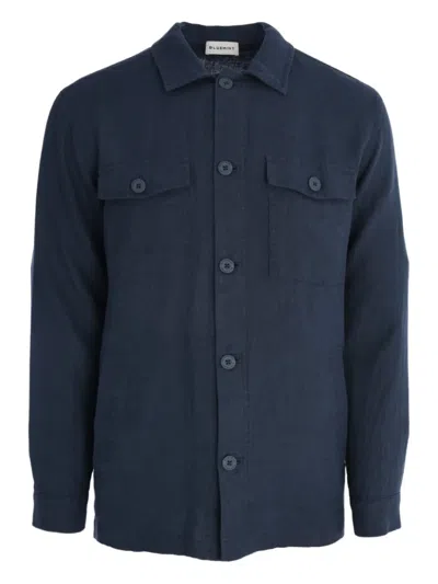 午夜蓝色 亚麻 钮扣 两个盖袋 长袖 翻领