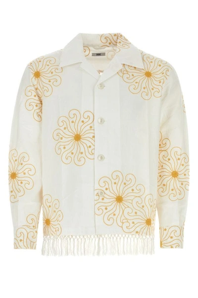 embroidered frayed-edge shirt from BODE featuring white, cotton, front button fastening, embroidered design, frayed edge, notched collar, front button fastening, long sleeves, buttoned cuffs and straight hem.
