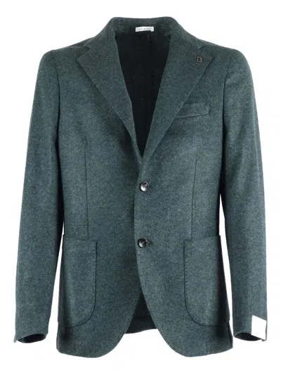 绿色 正面双纽扣 贴袋 平驳领 logo细节