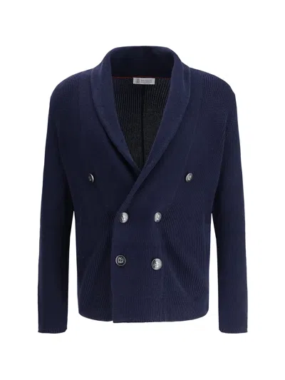 BRUNELLO CUCINELLI Double Breasted Ribbed Knit Button Cardigan In Blue