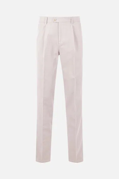 Brunello Cucinelli trousers crafted from light beige cotton gabardine. Featuring a front hook-button-zip closure, belt loops, multiple pockets, front pleats, and a center crease.