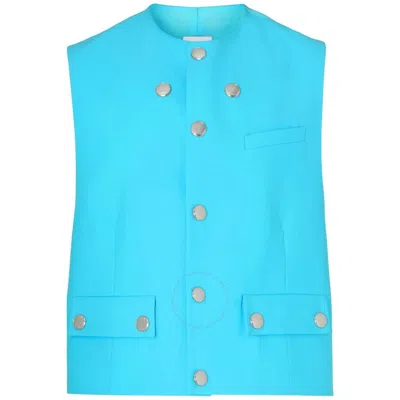 Burberry Mens Outerwear. Fashion category: Coats & Jackets. SKU: 8070166. Color: Bright Opal Blue. Burberry Mens Bright Opal Blue Round-Neck Wool Waistcoat. An Italian-tailored waistcoat in wool featuring chest welt pocket, press-stud flap pockets, a sleeveless design, logo-engraved press studs and a smooth back panel with back adjuster. 100% wool. Made in Italy.