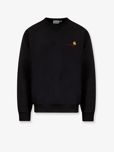 Carhartt WIP American Script Sweater in Black - Black. Size S (also in L, M, XL/1X). Self: 80% cotton 20% polyester Rib: 97% cotton 3% elastane. Made in Cambodia. Machine wash. Front Carhartt logo. Ribbed trim. Fleece lining. CHWF-MK10. I025475. About the designer: