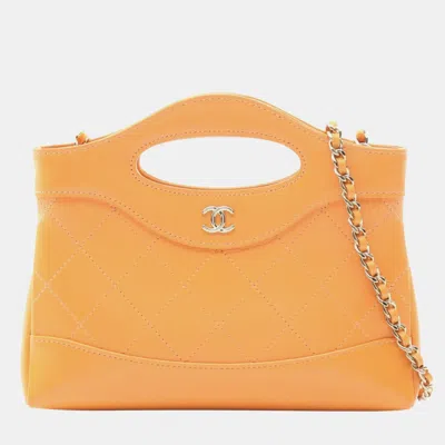 This Chanel 31 Nano shoulder bag is crafted from leather in a bright orange color. The compact design includes a chain shoulder strap and an open interior suitable for small items. Lightweight and easy to carry it works well as a mini day bag or accent piece.