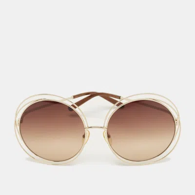 These Chloé Carlina sunglasses feature brown and gold gradient lenses set within delicate overlapping metal rings. The oversized round shape evokes retro inspired femininity. A signature design that captures Chloé's romantic elegance.
