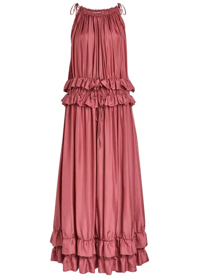 Embrace the epitome of feminine grace with this Silk Ruffled Maxi Dress by Chloé. Meticulously crafted from luxuriously smooth silk, this dress showcases a subtle, luminous sheen and an enchanting, fluid drape that feel exquisitely gentle against the skin. Its timeless, flowing silhouette is artfully elevated by layered, decorative ruffles at the waist and hem, which bring both volume and dynamic movement to the garment. The design is finished with a high neckline and delicate gathers, imparting a modern yet romantic appeal. The absence of extraneous patterns or branding allows the singular beauty of the silk and the artful cut to take center stage. Why choose this piece? Exclusively tailored by the renowned Parisian house, Chloé Premium silk for unparalleled softness and elegant luster Distinctive ruffled detailing for an effortlessly sophisticated look Impeccably comfortable, airy, and versatile for any refined occasion