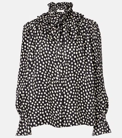 Chloe blouse is crafted from dots printed silk jacquard accented with a selftie ruffle collar and Mother of Pearl (Australia) buttons Stand collar; concealed button front Long blouson sleeves Gathered back yoke Button ruffle cuffs Loose fit Hip length Silk Dry clean Imported