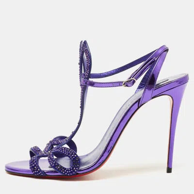 Deep purple suede defines the upper set with crystal detailing across the front straps. The open toe design sits on a slim high heel and fastens neatly at the ankle. Double L detailing is built into the strap layout finished with Christian Louboutin's signature red sole.
