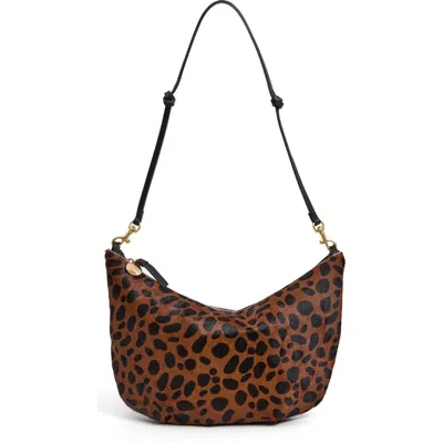 Introducing the Women's Hair-on Hide Lune Shoulder Bag by Clare V., a striking accessory in eye-catching leopard print. This bag is crafted from hair-on leather and features a zipper closure with a stylish knotted shoulder strap that can be adjusted from 26 inches. Measuring 13 inches wide and 8 inches high, it's perfect for carrying essentials like your phone, keys, and small wallet. Made in the USA and lined with chambray, this bag exudes quality and chic style without any interior or exterior pockets.