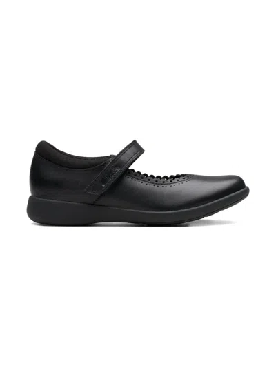 黑色 皮质鞋身 玛丽珍魔术贴 扇贝形边 橡胶平底