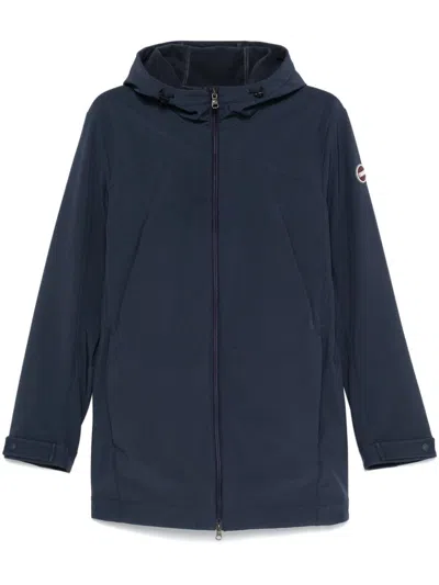 海军蓝色 软壳设计 防水 正面饰有双向拉链 抽绳兜帽 橡胶logo细节 长袖 摁扣袖口 四个正面摁扣口袋 抓绒衬里 平直下摆